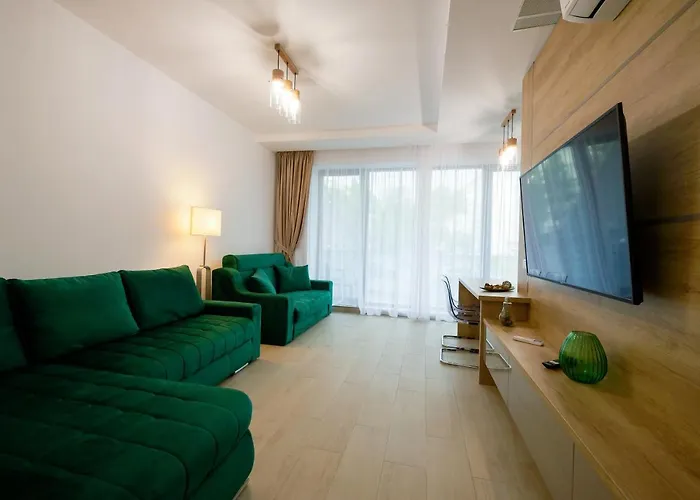 Green Luxury Apartment Lake On Mamaia van 70 m² is gelegen op slechts 5-minuten wandelafstand van Promenada Mamaia en net om de hoek bij Bridge Mamaia. Dit appartement met een terras is maar 450 meter verwijderd van het Ponton Mamaia gelegen.